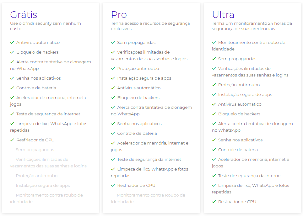 O dfndr security reúne mais de 25 funções que vão desde a verificação de vírus até a limpeza e otimização do celular. Além disso, o dfndr security disponibiliza a versão gratuita ou premium – dividida entre os planos Ads Free, Pro e Ultra – que removem as propagandas dentro app e libera o acesso a funções exclusivas. Confira: