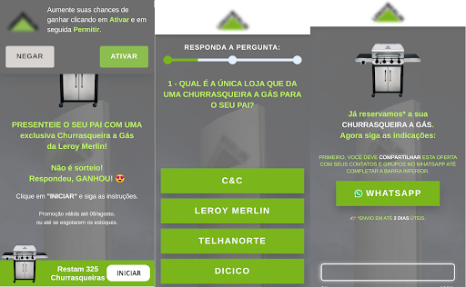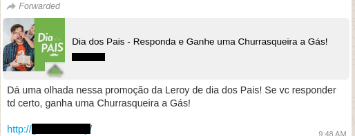 O dfndr lab identificou ainda um golpe no WhatsApp utilizando indevidamente o nome da Leroy Merlin, prometendo uma churrasqueira à gás aos que se cadastrassem em um suposto link de promoção de Dia dos Pais. Até o momento, o laboratório de cibersegurança já detectou mais de 157 mil compartilhamentos ao falso link promocional.