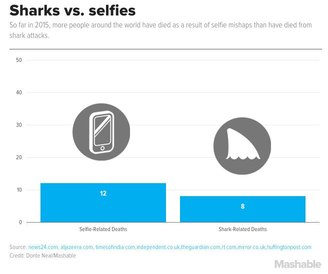 Morir por tomarse un selfie puede tratarse de una nueva enfermedad de la sociedad moderna. Y es que el site Mashable divulgó una investigación que compara los accidentes causados al intentarse tomarse uno mismo una foto y las muertes por ataques de tiburón. Sorprendentemente, 12 personas murieron en la intención de buscar su mejor ángulo, mientras que ocho no llegaron a sobrevivir a las emboscadas del temido animal marino.