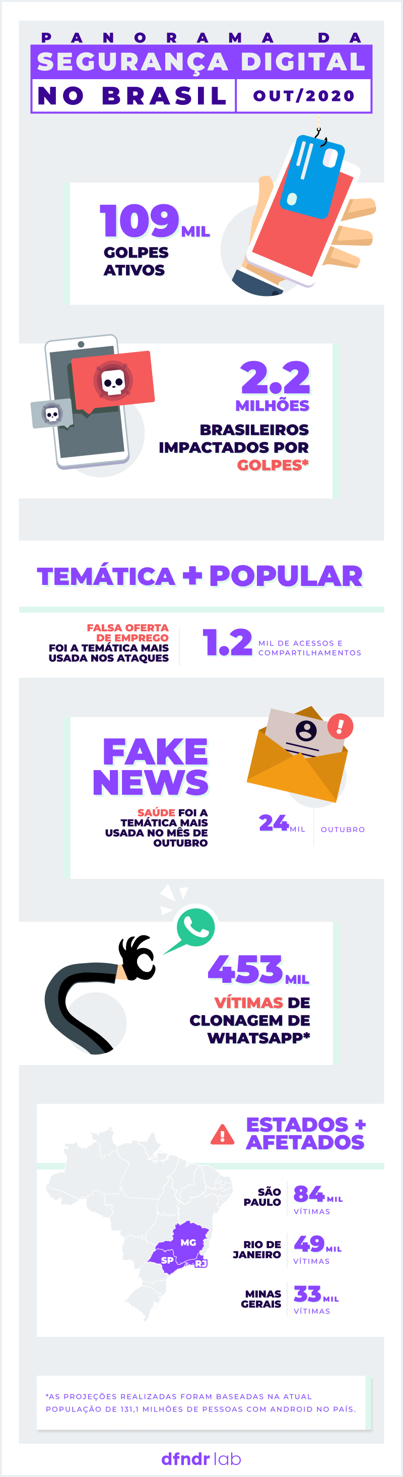 Um levantamento do dfndr lab, laboratório especializado em segurança digital da PSafe, analisou o quadro de cibersegurança no Brasil em outubro de 2020 e os principais riscos para os brasileiros. O estudo aponta que apenas em outubro 109 mil golpes estavam ativos na internet, um dado extremamente preocupante, pois este número indica que houve um aumento de 127% em comparação a setembro. Vale lembrar que com a proximidade da Black Friday, essa contagem pode atingir valores maiores em novembro.