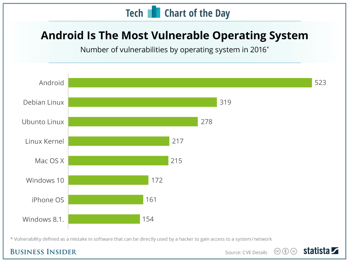 Um estudo feito pelo centro de pesquisa Statista anunciou que entre os meses de janeiro e dezembro do último ano foram descobertas 523 vulnerabilidades no sistema. Quantidade mais que suficiente para fazer com que diversos usuários tenham seus celulares atacados por hackers.
