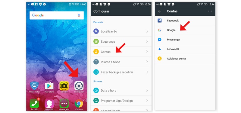 1. Busque pelo ícone de engrenagem Configurar, selecione Contas e toque em Google.