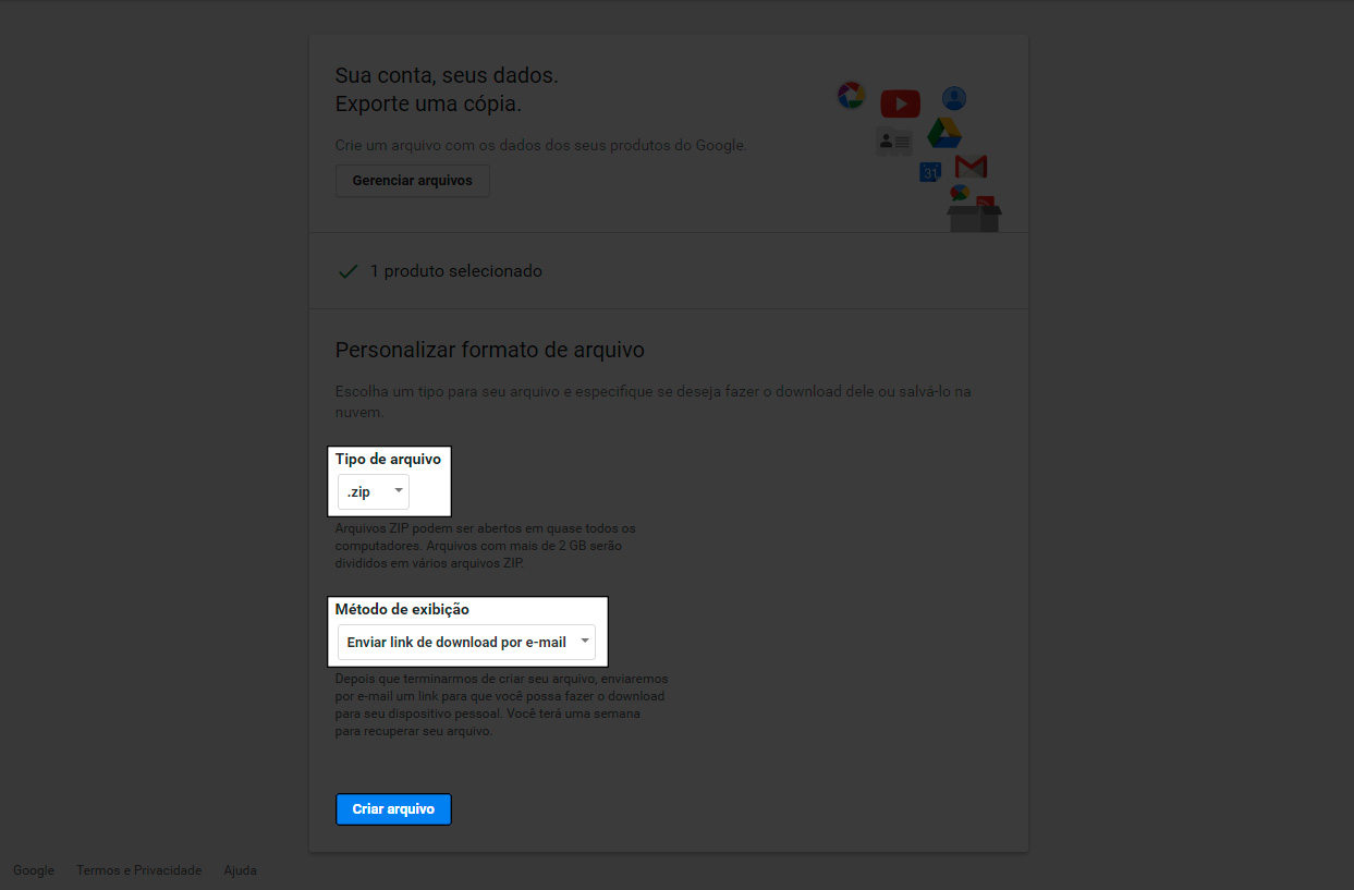 4. Escolha o “Tipo de Arquivo” e em “Método de Exibição” a forma que você deseja receber o link de download. Para finalizar, clique em “Criar Arquivo”.