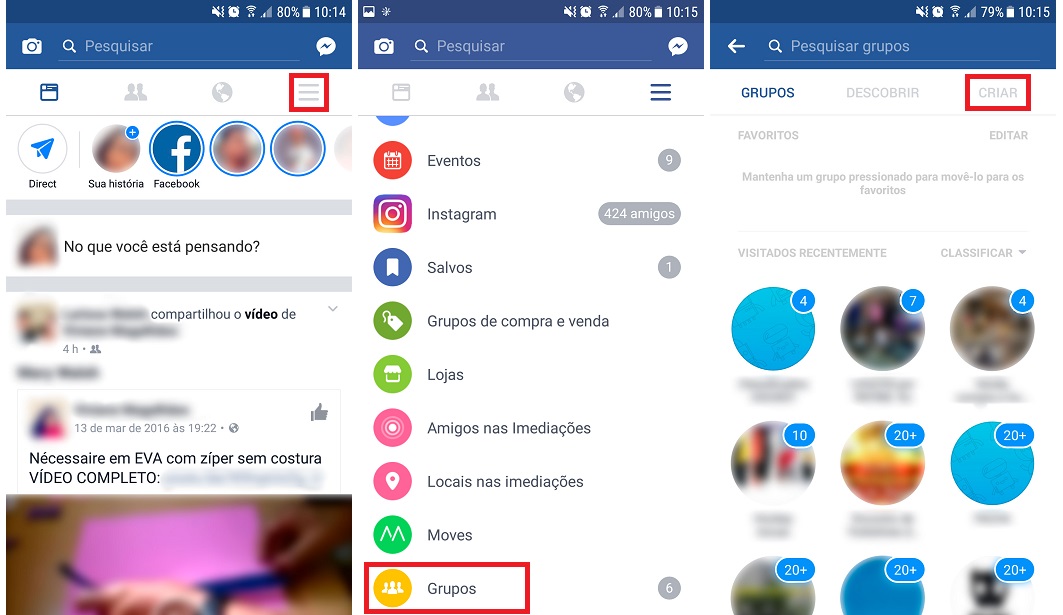 Abra o seu Facebook, clique nas três barrinhas, selecione a opção Grupos e toque em Criar.