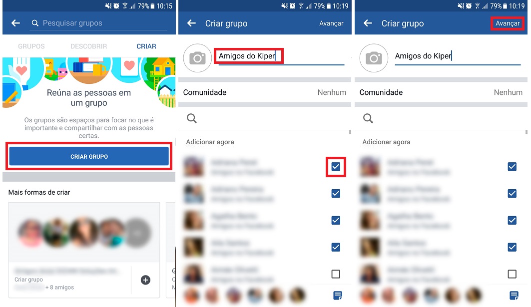 Em seguida, clique em Criar grupo, escolha um nome para o grupo, selecione os amigos que deseja adicionar e toque em Avançar.