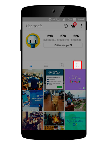 Clique no desenho da banheirinha, localizado logo abaixo da publicação que deseja salvar. Para visualizar os arquivos salvos, vá até o seu perfil, e clique na figura da bandeirinha. A tela seguinte mostrará todas as mídias salvas.