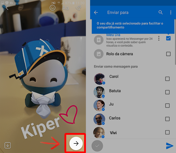 3. Terminou de editar? Então, clique na setinha no canto inferior da tela. Em seguida, selecione com quem você deseja compartilhar a imagem. Por padrão, a opção “Meu Dia” já fica marcada. Tudo que você postar usando esta opção ficará visível para todos os seus contatos do aplicativo por 24 horas. Mas se você selecionar para quem enviar, as pessoas receberão o vídeo ou a foto como uma mensagem normal no Messenger.