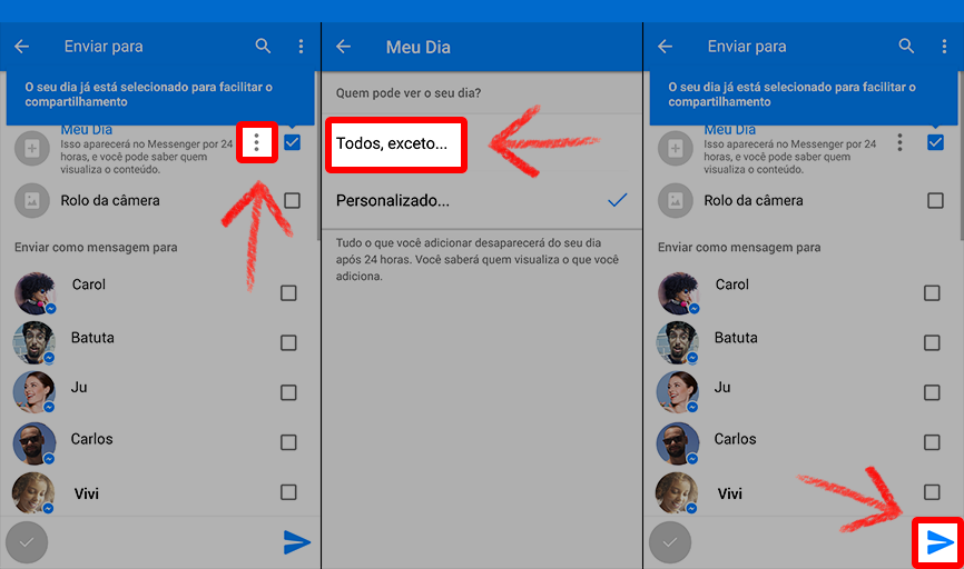 4. Se você quiser que só algumas pessoas vejam a sua história, toque nos “três pontinhos” e, em seguida, marque quem você NÃO quer que veja a sua história, tocando em “Todos, exceto…”. Se você tocar em “Personalizado”, poderá escolher quais amigos podem ver o seu post no “Meu Dia”. Para postar, toque na setinha, no canto inferior direito tela.