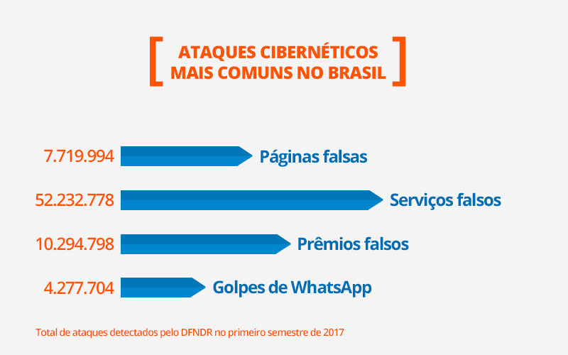 Somente no primeiro semestre deste ano, o DFNDR Security, principal aplicativo antivírus do Brasil, detectou 93 milhões de ataques; dentre eles, mais de 7 milhões de pessoas foram afetadas. Existem diversos tipos de golpes virtuais. Contudo, há quatro ataques preferidos pelos hackers, devido a facilidade de disseminação e quantidade de pessoas que ainda caem nessas ciladas.