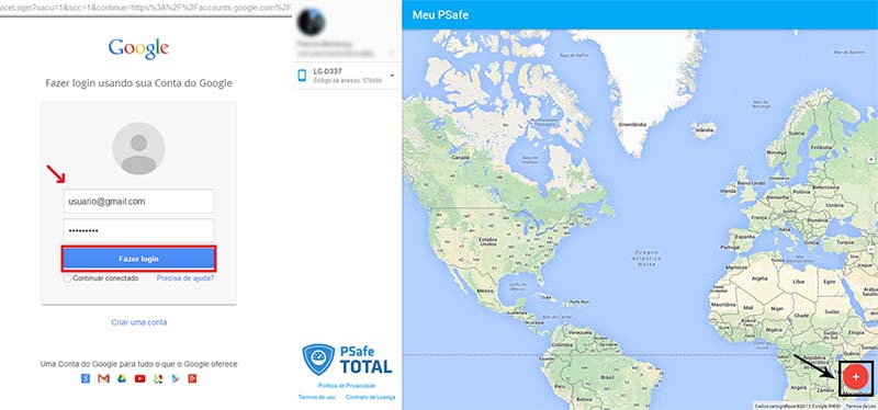 Acesse o meu.psafe.com e entre com o seu gmail cadastrado no Antifurto. Clique no botão de mais no canto inferior direito.
