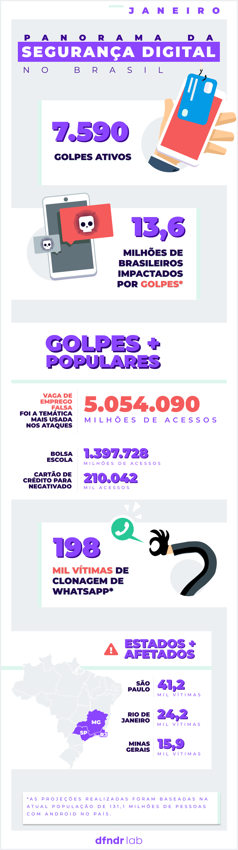 Juntos, estes ataques impactaram 13,6 milhões de usuários em todo o país. Vaga de emprego falsa foi a temática mais usada nos golpes, atingindo mais de 5 milhões de pessoas.