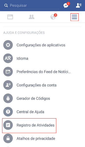 Passo 1. Abra o seu aplicativo do Facebook e toque no ícone de três barrinhas. Em seguida, vá em “Registro de Atividades”.