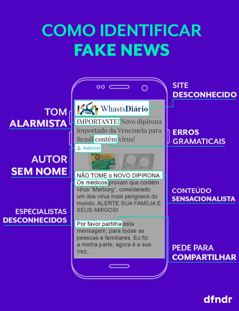 Para você ficar protegido, o especialista em privacidade do dfndr lab, Frank Vieira, dá algumas dicas: “há alguns sinais que ajudam a identificar uma notícia falsa, como o título sensacionalista, erros de grafia no texto ou a falta de fonte confiável na matéria. O ideal é sempre desconfiar quando vir algum destes sinais e não clicar no link suspeito para não colocar seu celular em risco. Mas, para ficar realmente protegido, o ideal é ter um aplicativo de segurança instalado no celular que te alerta em tempo real sempre que te enviam uma notícia falsa no WhatsApp, Messenger e SMS”.