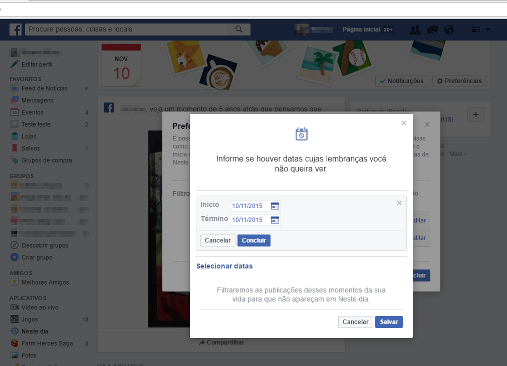 Para bloquear as memórias por data, repita os mesmos passos até a janela de preferências, depois clique em “Datas”, e, depois, em “Selecionar datas”. Indique o início e fim do período que você quer filtrar. Cliquei em “Concluir” e adicione um novo um período no filtro se quiser.