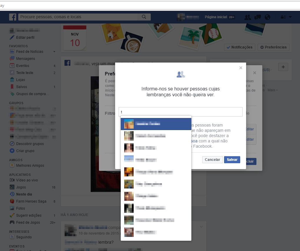 Em “Pessoas”, digite as primeiras letras do nome da pessoa que deseja bloquear das suas “Memórias”. Selecione ela na lista e clique em “Salvar”.