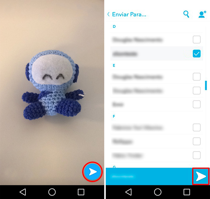 Passo 3: Na lista, selecione o amigo para qual deseja compartilhar e toque de novo no botão de enviar.