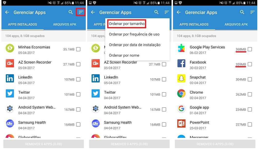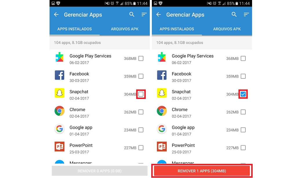 Se desejar apagar algum aplicativo que esteja ocupando muita memória, é só tocar no quadradinho cinza ao lado da quantidade de MB e selecionar Remover apps.