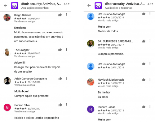 No Google Play, por exemplo, o dfndr security recebeu mais de 5,7 milhões de avaliações e tem, no total, 4,6 estrelas de satisfação. Isso significa que mais de 90% de todas as pessoas que instalaram deram uma nota positiva para o aplicativo. Confira alguns dos comentários: