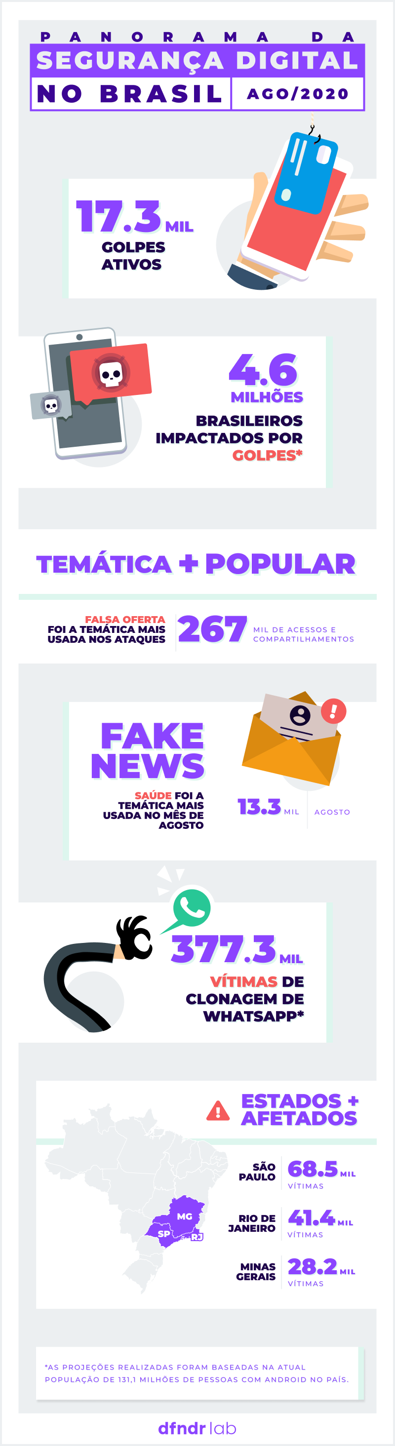 O dfndr lab, laboratório especializado em segurança digital da PSafe, realizou um levantamento sobre o cenário da cibersegurança no Brasil referente a agosto deste ano. O estudo projeta que cerca de 377 mil pessoas tenham sido vítimas do golpe de Clonagem de WhatsApp no país, somente no último mês, o que resultaria em uma média de 12 mil brasileiros afetados por dia pelo golpe. Em comparação com janeiro deste ano, o número de vítimas da Clonagem foi 90% maior. O estudo mostra São Paulo como o epicentro dos ataques, com 68.5 mil afetados, seguido pelo Rio de Janeiro, com 41.4 mil, e Minas Gerais com 28.2 mil.