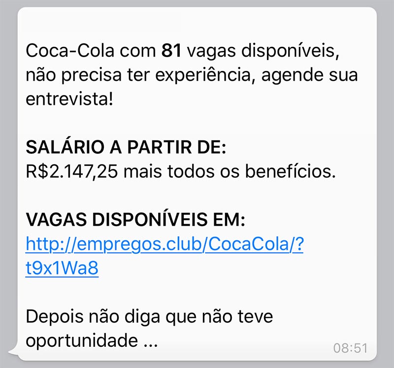 O usuário recebe uma mensagem pelo WhatsApp, ou qualquer outra rede social, oferecendo emprego na famosa marca de refrigerantes.