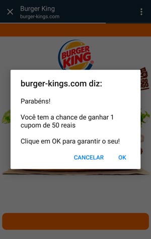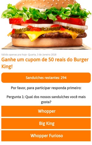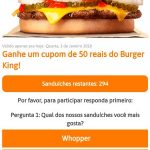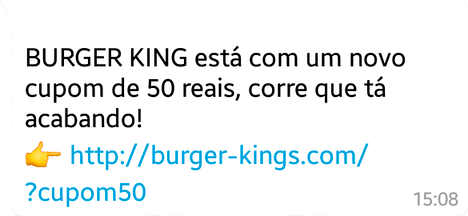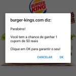 A vítima recebe de algum amigo ou conhecido um link prometendo um cupom de R$ 50 na rede de fast food. Ao clicar, é direcionada a responder a três perguntas para ganhar o suposto voucher (“Qual dos nossos sanduiches você mais gosta?”; “Você está satisfeito com o nosso atendimento?”; “Você indicaria o BK aos seus amigos?”).