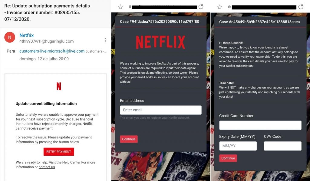 Emilio Simoni, diretor do dfndr lab, explica o esquema: “Na intenção de enganar clientes da empresa, os golpistas utilizam indevidamente o nome da plataforma de streaming. Eles abordam suas vítimas através de e-mails com um link malicioso, que as direciona para um site que se passa pelo site oficial da Netflix. Ao clicar neste link, a vítima é induzida a fornecer dados pessoais e de cartão de crédito para uma suposta atualização de cadastro. Aqueles que fornecem estas informações transmitem aos golpistas seus dados sensíveis, ficando vulneráveis a fraudes bancárias”.