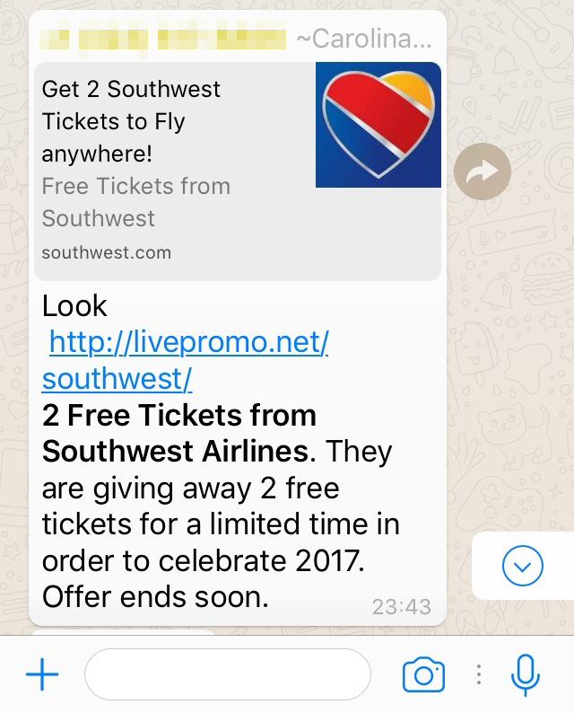 O link é compartilhado pelo WhatsApp e oferece 2 bilhetes de avião pela Southwest Airlines, companhia aérea americana. Ao clicar, você será encaminhado para links que oferecem prêmios ou informam que seu celular foi infectado. Tudo isso é mentira! Na verdade, a intensão dos golpistas é fazer você clicar e compartilhar com outros amigos para aumentar a quantidade de vítimas. O falso site pode pedir seus dados e, com isso, roubar senhas e até dinheiro de sua conta bancária.