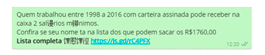 A possibilidade de sacar mais dinheiro do Fundo de Garantia por Tempo de Serviço (FGTS) chamou atenção não só dos trabalhadores, como também dos hackers. Os bandidos estão se aproveitando disso para enviar pelo WhatsApp mensagens falsas dizendo que você está pronto para receber R$ 1.760,00 do FGTS. A fraude leva você a se cadastrar em serviços de SMS pago ou baixar aplicativos “piratas”, que podem infectar o celular e deixá-lo livre para ataques de hackers.