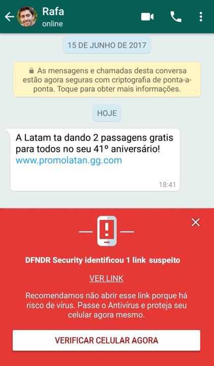 Existem antivírus no mercado que apresentam todas os benefícios listados acima, como é o caso do dfndr security – aplicativo gratuito para Android. Ele oferece um pacote com funções exclusivas para segurança e outras para melhorar a performance do seu celular. Uma delas é o Bloqueio de Hackers, que identifica se um link enviado por um amigo por SMS, WhatsApp ou Facebook Messenger é malicioso logo no momento em que você recebe a mensagem.