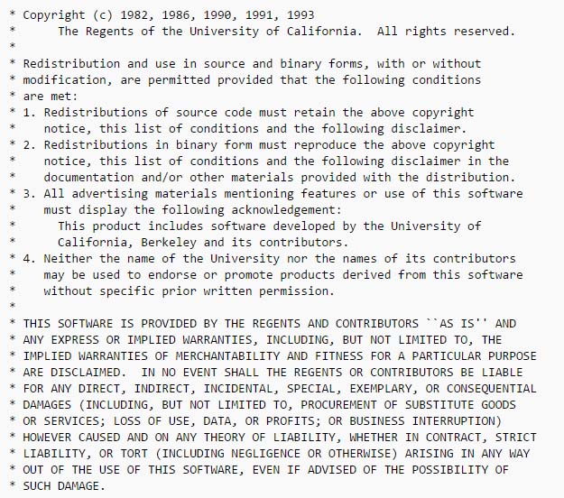 A versão original, abaixo, contém uma cláusula que ficou conhecida como “cláusula propaganda”, pois determina que seja incluída uma citação no código fonte dos trabalhos derivados dizendo que o produto contém software desenvolvido pela Universidade de Berkeley. Em 1999 ela foi retirada. Um dos motivos para a retirada foi que essa cláusula causava incompatibilidade com a licença GPL.