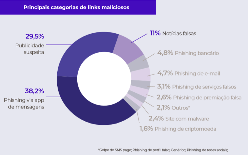 Com 16,7 milhões de detecções no trimestre, o que representa 38,2% do total de registros no período, a categoria de Phishing via app de mensagens se mantém, pela quinta vez, como o meio favorito dos cibercriminosos para espalhar links maliciosos. Em segundo lugar, aparece a Publicidade suspeita, com 12,9 milhões registros e, em terceiro lugar, Notícias falsas, com 4,8 milhões de ciberataques.