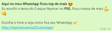 O usuário recebe uma mensagem por meio de grupos e conversas privadas no WhatsApp. A armadilha promete ao usuário a possibilidade de escolher o clube em que gostaria de ver o jogador Neymar atuar e, a partir disso, ter acesso a um plano de fundo personalizado.