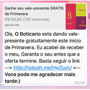 Os ataques funcionam de forma bem parecida: a vítima recebe um link de um contato, informando que ela ganhou brindes ou descontos. Ao tocar, ela é levada a uma página falsa para fornecer dados e, em seguida, compartilhar o link malicioso. Por fim, na maior parte dos casos, a vítima é induzida a baixar apps falsos, que poderão danificar ou infectar seu celular com vírus, ou é cadastrada indevidamente em um serviço de SMS pago e, a cada assinatura, os hackers recebem dinheiro em troca.