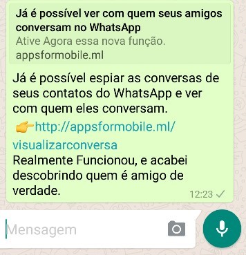 Recentemente, o aplicativo de segurança dfndr security descobriu mais um golpe na plataforma. Quase 100 mil usuários clicaram em um link que prometia espionar a conversa de outros contatos sem que eles soubessem.