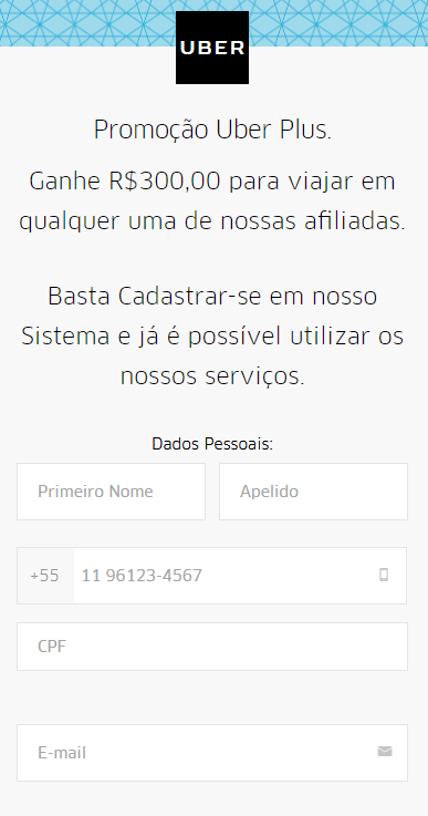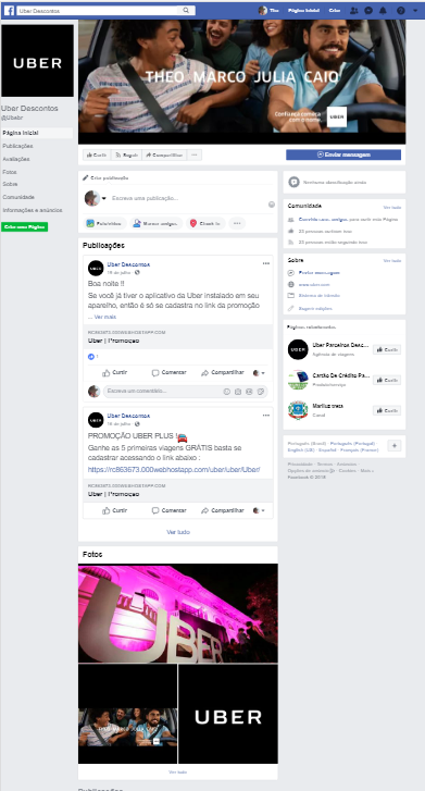 Um esquema envolvendo mais de 200 páginas e perfis falsos utilizando indevidamente o nome do aplicativo Uber foi identificado pelo laboratório de cibersegurança dfndr lab. Para convencer as vítimas a aderirem ao golpe, criminosos ofereciam falsos cupons de desconto de R$300 que seriam parte da Promoção Uber Plus. Até o momento, os especialistas do dfndr lab já detectaram 84 mil tentativas de acesso e compartilhamentos aos links envolvidos no golpe.
