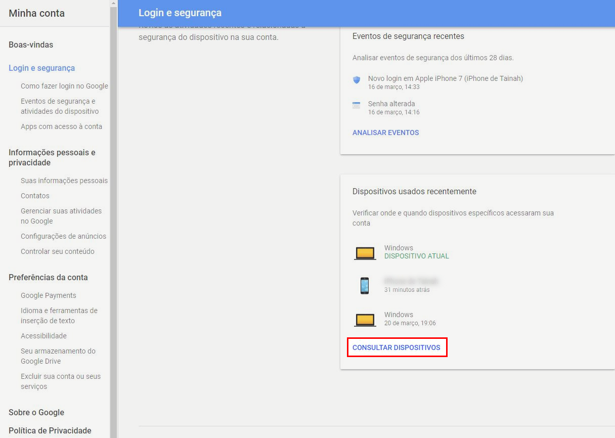As ferramentas do Google, por exemplo, permitem que você veja quais aparelhos ainda têm acesso à sua conta e remova aqueles que você já não usa ou tem mais. Para isto, você pode seguir dois modos, ambos a partir do acesso à opção “Minha conta” via computador ou notebook: