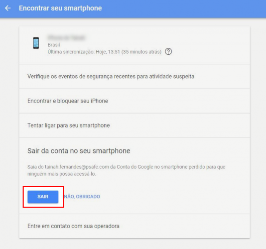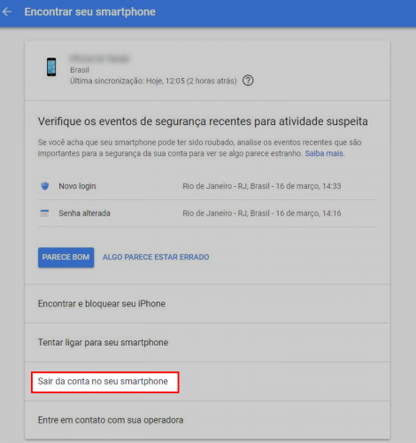 Modo 2: Depois de acessar “Minha conta”, vá até a a seção “Encontrar o seu smartphone”. Escolha “Sair da conta no seu smartphone”, clique no dispositivo e, em seguida, clique em “Sair”.