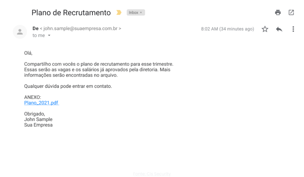 Por se tratar de um conhecido, a vítima não pensará duas vezes antes de baixá-lo, mas o remetente pode ter sido falsificado. Caso os e-mails de colaboradores de uma empresa tenham sido vazados, isso facilita com que um cibercriminoso tenha acesso a esse dado e o utilize para ataques direcionados.