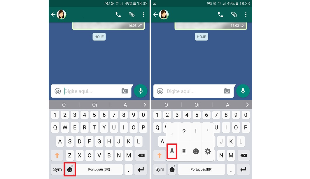 Abra uma conversa no WhatsApp, pressione o ícone da carinha sorrindo que aparece ao lado da tecla Sym e selecione o Microfone.