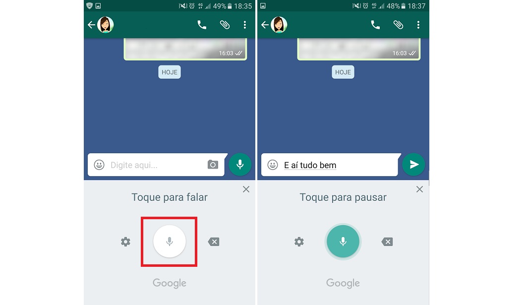 Aí é só tocar no botão central para iniciar o áudio e tudo o que você falar será escrito automaticamente pelo WhatsApp.