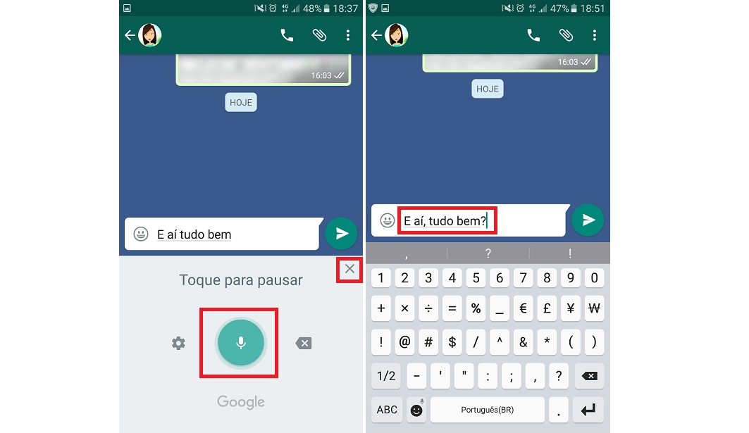 Para terminar, basta tocar novamente no botão central e depois no X. Mas, por enquanto, a função não coloca nenhum tipo de pontuação nas frases. Então antes de enviar a mensagem, faça seus ajustes e envie!