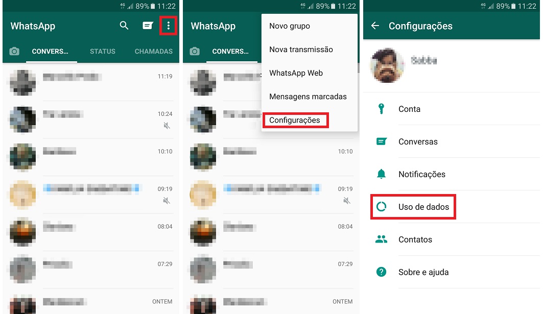 Abra o WhatsApp, toque nas três bolinhas, selecione Configurações e depois Uso de dados.