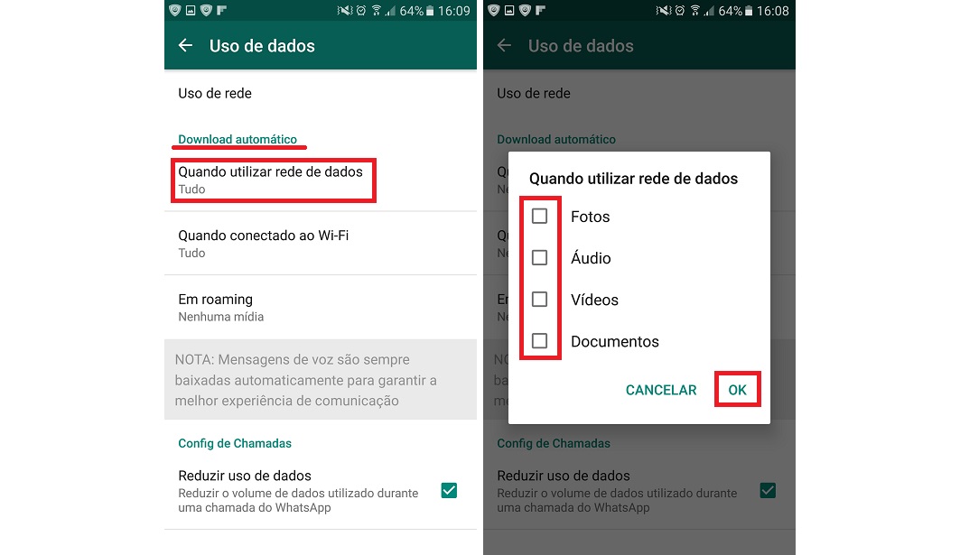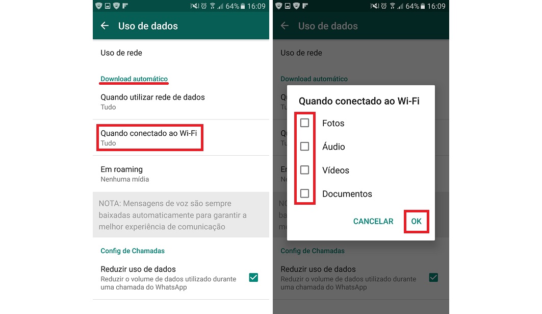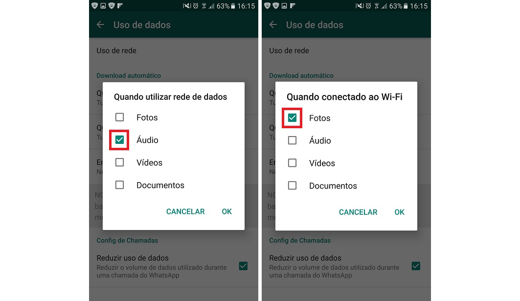 Caso queira que o WhatsApp baixe automaticamente um dos tipos de arquivos acima, é só deixá-lo selecionado.
