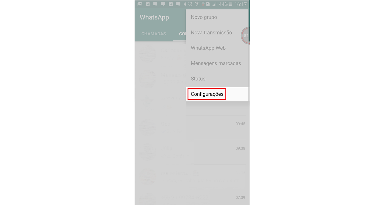 Abra o WhatsApp, toque no Menu e depois em Configurações.
