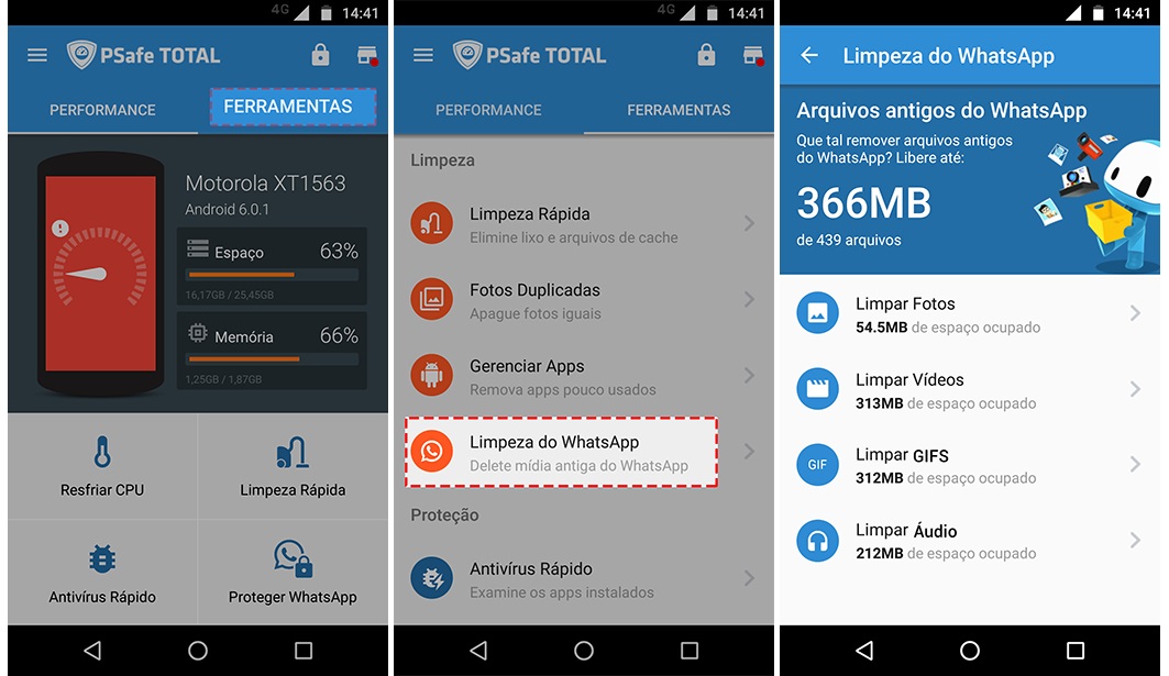 Abra o DFNDR Security, toque em Ferramentas, selecione Limpeza do WhatsApp e escolha qual o tipo de mídia você deseja limpar. Mas não se preocupe, o DFNDR Security não vai apagar tudo de uma vez sem sua permissão.