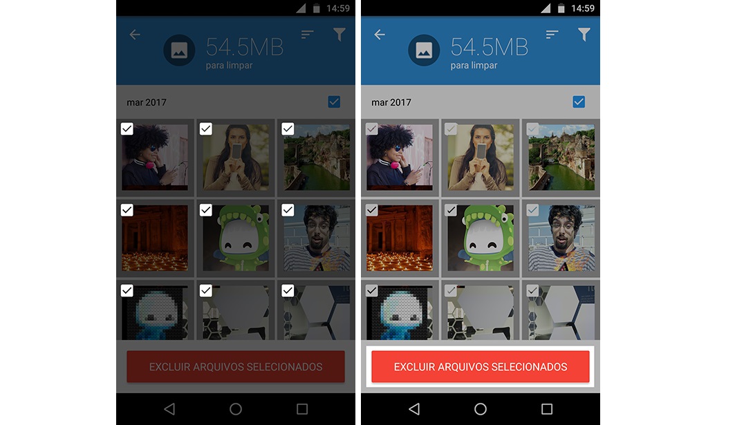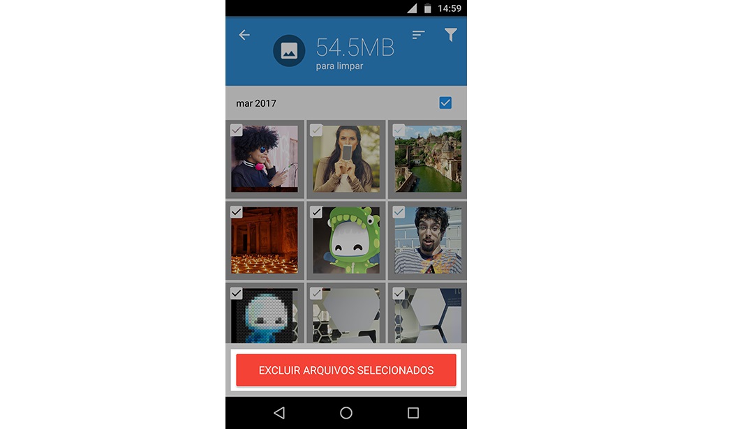 – Caso queira excluir somente alguns arquivos, desmarque eles tocando nos quadradinhos brancos (