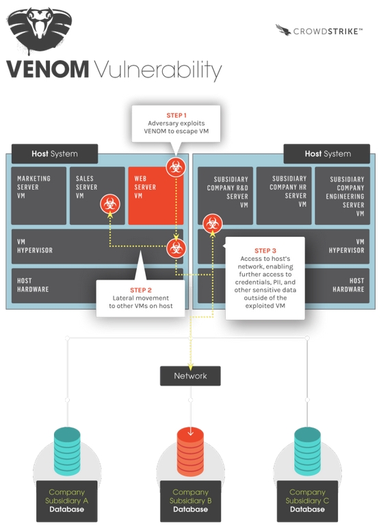 A maioria dos datacenters aloca inúmeros cliente no mesmo servidor, separando-os em máquinas virtuais alimentadas pelo hypervisor host. E como o VENOM acessa diretamente o hypervisor, ele consegue se mover de uma máquina virtual a outra.