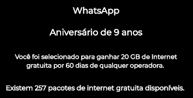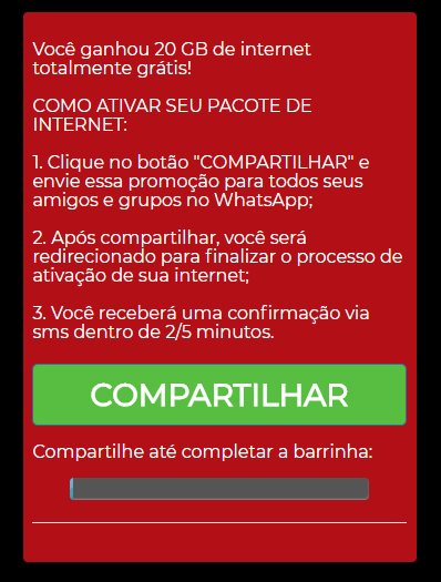 Ao clicar no link, o usuário é direcionado para uma página na qual ele é informado que foi selecionado para ganhar até 20GB de internet e apresenta, ainda, um número fictício de quantidade de pacotes grátis disponíveis para habilitação. Nesta página, o usuário é orientado a responder três perguntas: “Quantos dias de internet gratuita você deseja ativar?”; “Quantos GB você gostaria de receber de sua operadora?”; “Qual rede você gostaria de ativar?”. Após responder à última pergunta, a pessoa é informada que, para ativar o pacote gratuito de até 20GB de internet, ela deverá compartilhar com três amigos e grupos de WhatsApp. Após o compartilhamento, a suposta oferta de internet móvel estaria disponível em até cinco minutos para o usuário. No entanto, ao invés disso, surge uma página de alerta no celular da vítima informando supostos problemas no celular e orientando o download de aplicativos maliciosos.