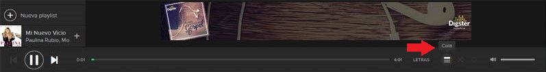 Mientras estés escuchando una canción en la radio Spotify, cliquea en el atajo de la lista de reproducción que se ubica en la barra de volumen de ésta.