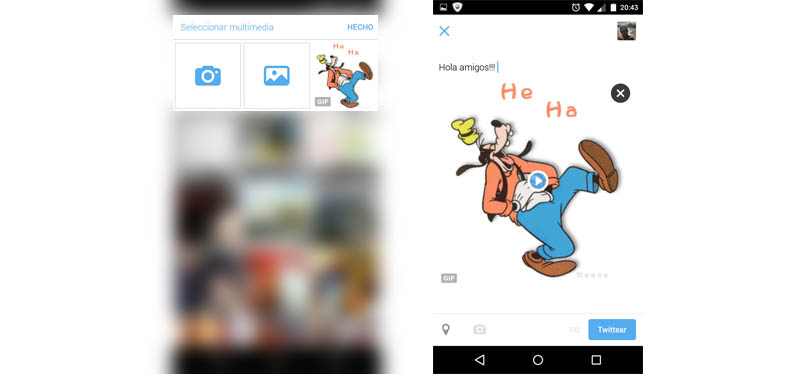 2) Luego andas a tu Twitter y como de costumbre das clic en ‘Twittear‘, picas en el ícono de la cámara y seleccionas el gif animado guardado. Escribes tu tweet y listo, lo publicas.